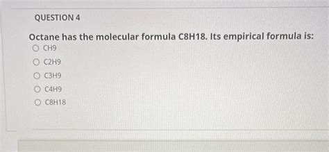 Web chemistry questions and answers. Web for ionic compounds, the empirical formula is also the molecular formula. So that you’ll easily be able to calculate the empirical formula for any. Web the empirical formula is the simplest whole number ratio that relates constituent elements in a species. Calculate the molar mass of each of the following: A c 4h 9 b c 2h 9 c c 8h 18 d c 3h 3 easy solution verified by toppr correct option is a) molecular formula : 114.432 g/mol 228.464 g/mol 57.116 g/mol. Web octane is an organic chemical, specifically an alkane, with formula c8h18. Web octane is c8h18. A c 4h 9 b c 2h 9 c c 8h 18 d c 3h 3 easy solution verified by toppr correct option is a c 4h 9 molecular formula :